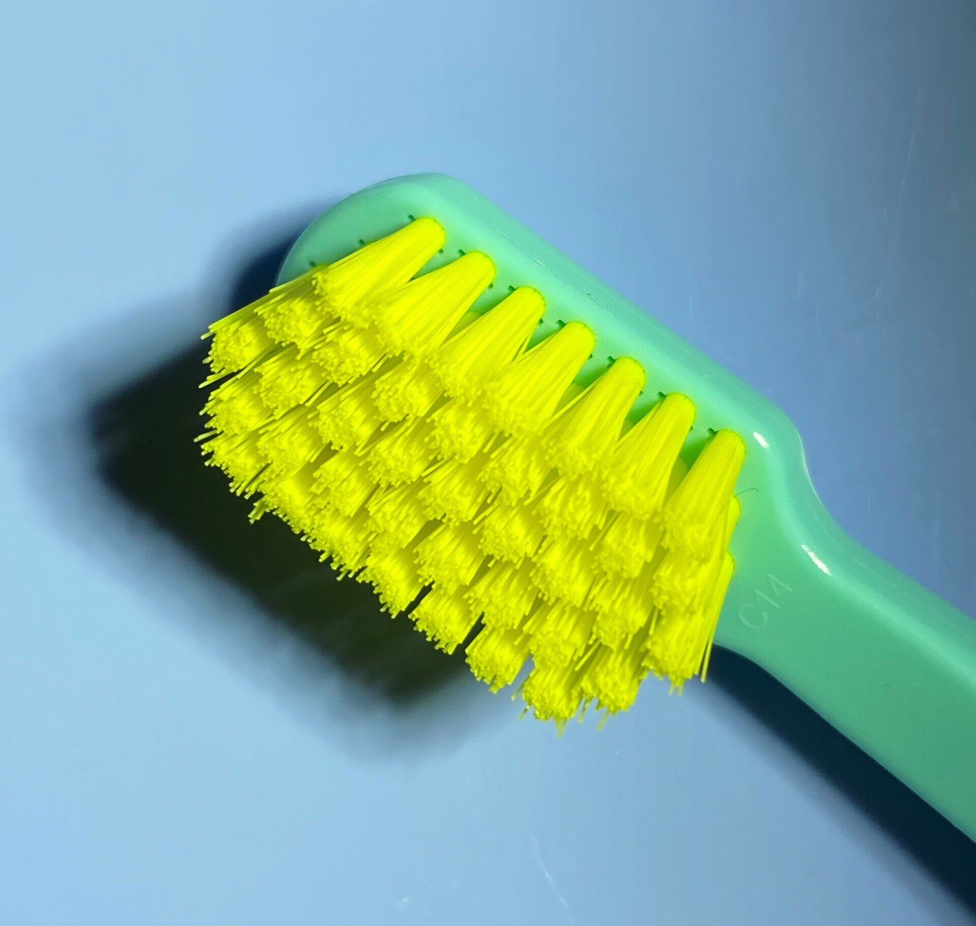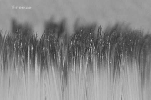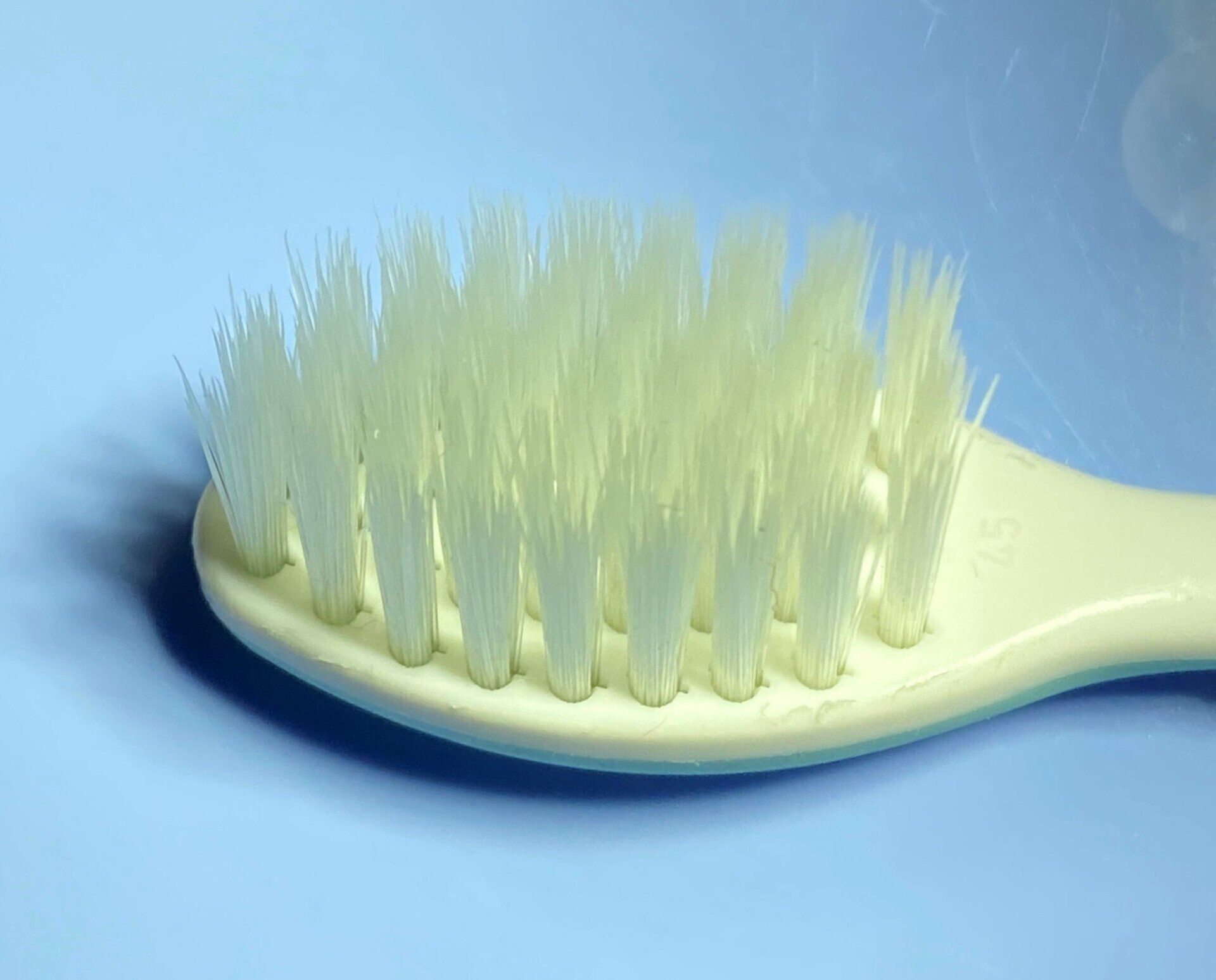 Sie sollte einen Bürstenkopf mit einer hohen Zahl an weichen, gut abgerundeten Nylonborsten haben. Das Minimum sind 1600 Borsten (z. B. 40 Büschel a 40 Borsten). Die Weichheit der Borsten ist eine Funktion ihres Durchmessers, weiche Borsten haben einen Durchmesser von 90-120 µm, mittelweiche Borsten von 150-200 µm. Das Borstenfeld sollte sich auf weicher Haut nicht "kratzig" oder "schrubbig" anfühlen. Harte oder scharfe Borsten können das Zahnfleisch beschädigen und bei hohem Putzdruck zu Zahnfleischrückgang führen! Die dünnsten Borsten hat derzeit die Coraprox CS 12460 mit einem Borstendurchmesser von 0,08 mm (80µm). Nicht ohne Grund nennt die Firma ihre Borsten daher "Filamente" (von Filamentum, lateinisch für Fadenwerk).