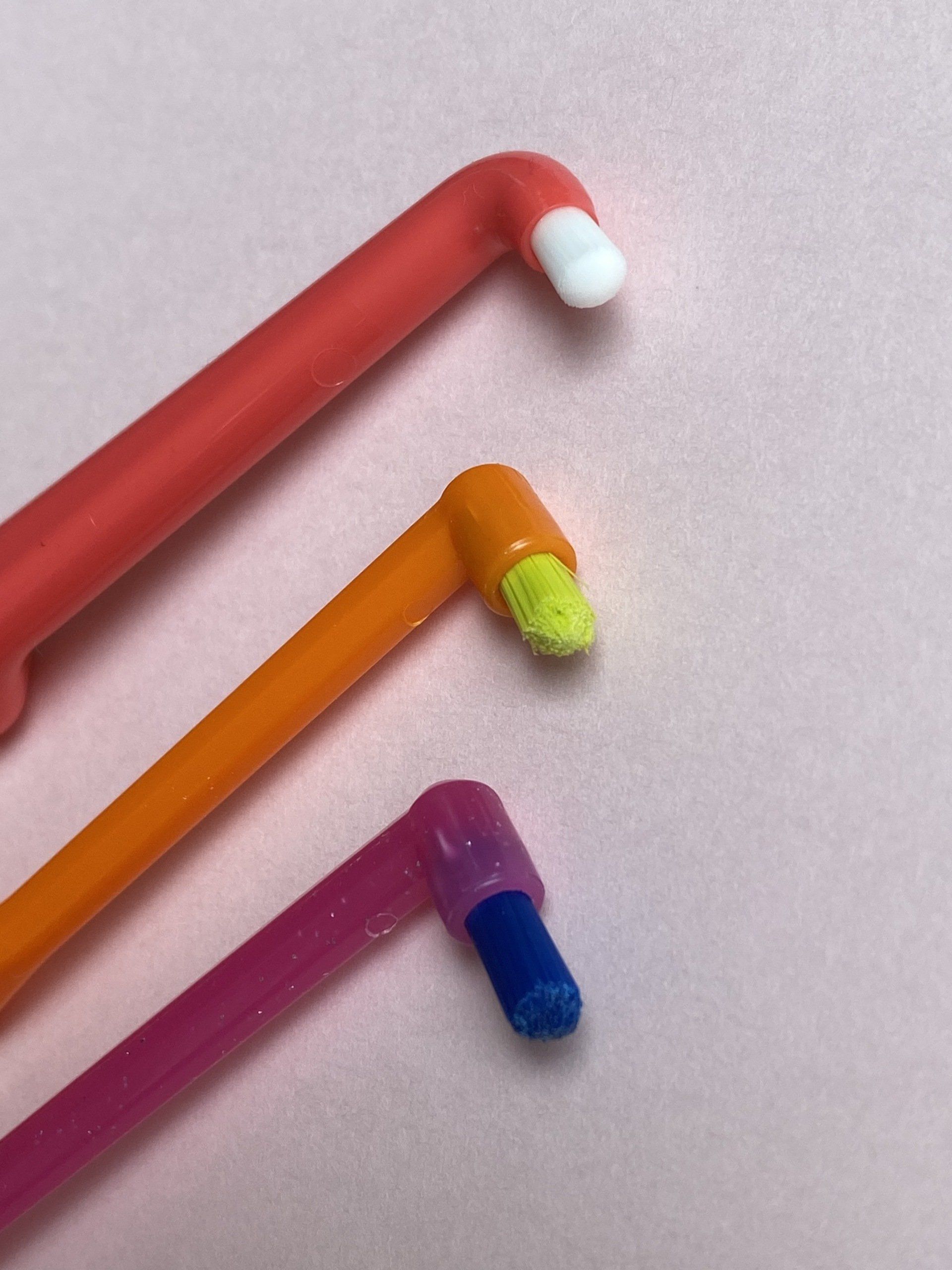 Die Curaprox ATA-Bürste (von "Acurate Total Access", Bild oben) ist nach dem Prinzip des verkleinerten Bürstenkopfes für eine bessere Ereichbarkeit aller Zahnflächen gebaut. Unter Umständen ereichen Erwachsene auch mit einer Kinderbürste aufgrund des kleineren Kopfes so bessere Ergebnisse. Probieren Sie es einfach einmal aus!